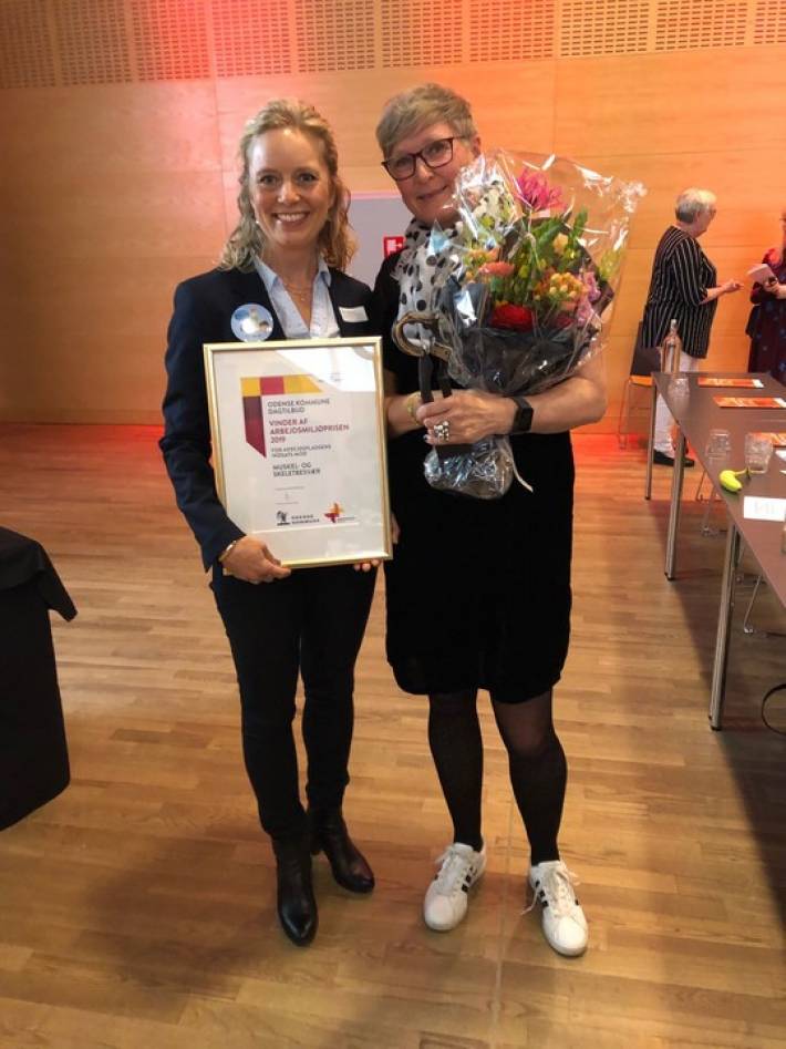 HR- og Arbejdsmiljøkonsulent, Karen Louise Reeh, og ergonomivejleder, Lotte Sanner Kjeldsen, fremviser stolt beviset for Arbejdsmiljøprisen 2019. Foto: Odense Kommune
