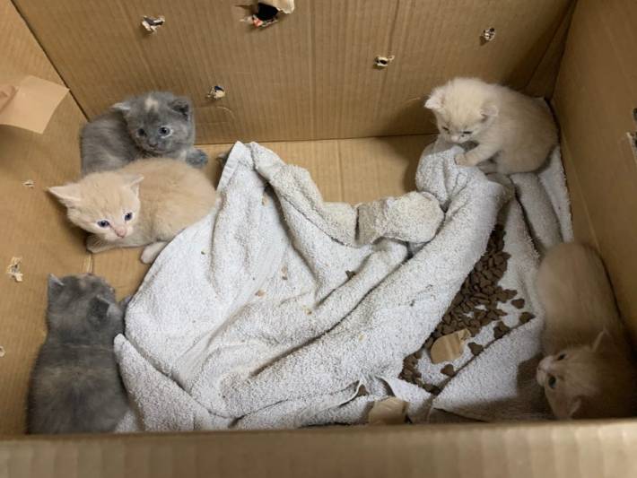 "Da kassen blev åbnet sad 5 små skræmte killinger på ca. 2-3 uger og kiggede op. Der var lagt mad i kassen, men ingen vand..... og en papkasse holder ikke længe i dette vejr, så heldigvis er de fundet i tide.......Men hvad hvis missemor var hoppe ud af kassen inden den blev fundet... så havde killingerne ikke overlevet længe... Det var heldigvis ikke tilfældet denne gang."